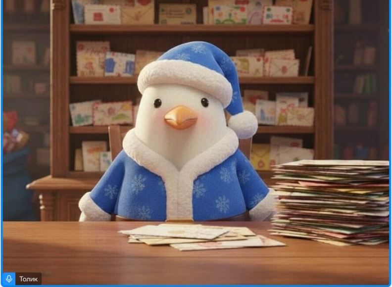 В канун Нового года можете пригласить Толика, нашего ИИ-персонажа, на встречу, чтобы он поздравил всех участников. Для этого напишите в чате специальную фразу: «Толик, перерыв на поздравление!». Он присоединится к конференции, и во время звонка будет показан короткий праздничный видеоролик.