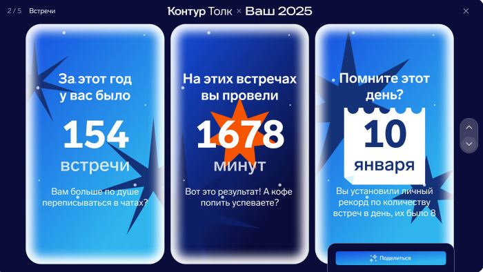 Сервис Контур.Толк представит обзор ваших успехов в сфере коммуникаций за прошедший год: покажет количество проведенных вами встреч и время, затраченное на обсуждение рабочих вопросов. А также поможет вам создать праздничное настроение – выберите новогодний фон и получите поздравление от нашего виртуального персонажа Толика.